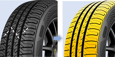 Enhanced cavity shape enables a more squarish and balanced footprint to maintain a larger contact patch and reduces contact pressure. This leads to extended mileage performance.
